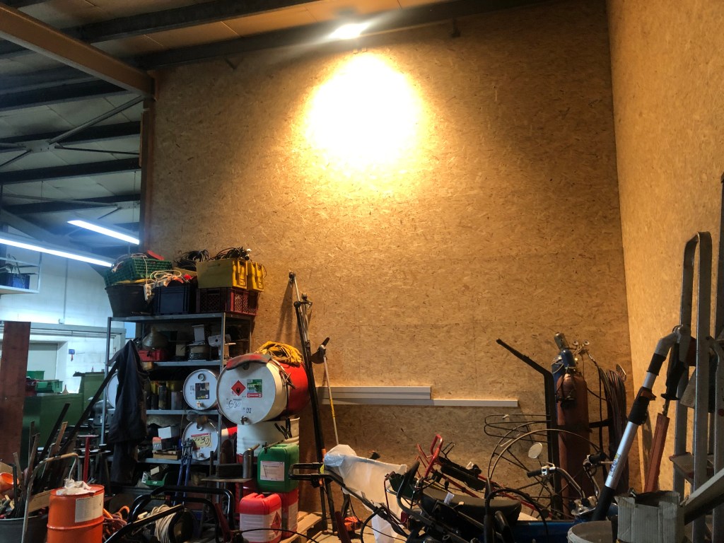 Die Abteilung der Halle ist fertig. Die großen Platten waren ja relativ schnell an der Wand aber oben im Hallendach gab es viel zu schneiden und das kostete gehörig Zeit. Das Ziel war, alles dicht hin zu bekommen damit es im zuerst vermieteten Teil staubfrei ist. Denn im anderen Teil soll zum Jahreswechsel 22/23 ein Schreiner reinkommen.