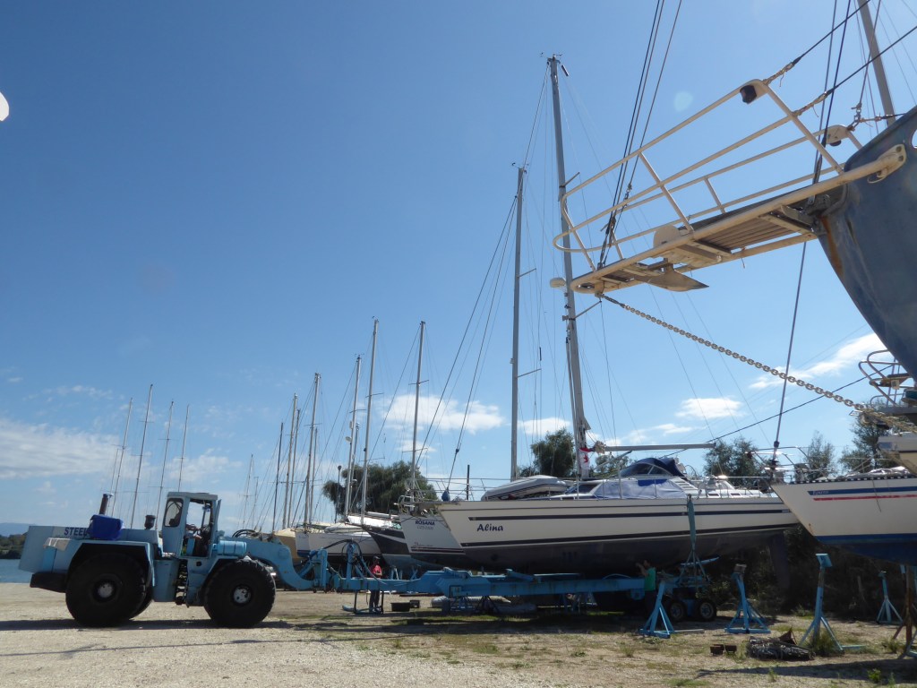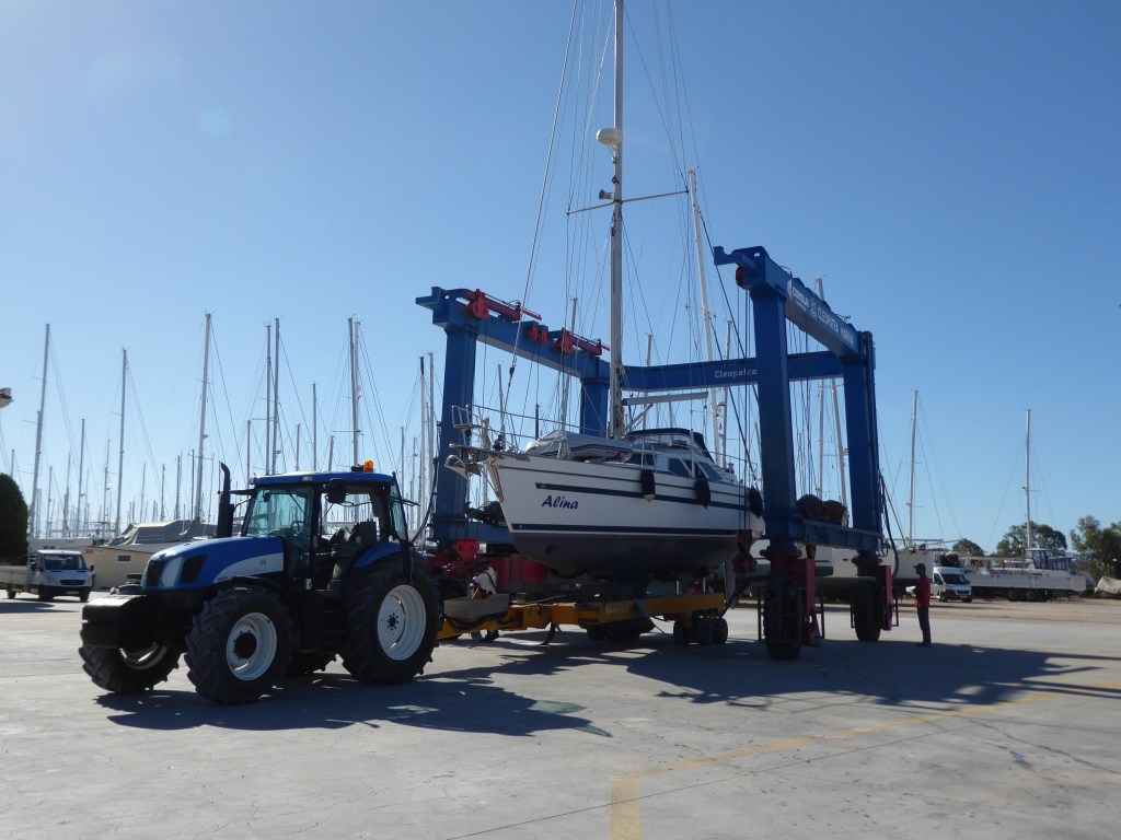 Kaum steht es fest auf seinem Platz legen wir mit dem Rest fürs winterfest machen los. Wassersystem leeren, Motor Glysantin rein, alles abdecken und mit Wolfgang über den Geräteträger sprechen. Irgendwann fallen wir müde ins Bett. Am nächsten Morgen stehen wir sehr früh auf und brechen auf.