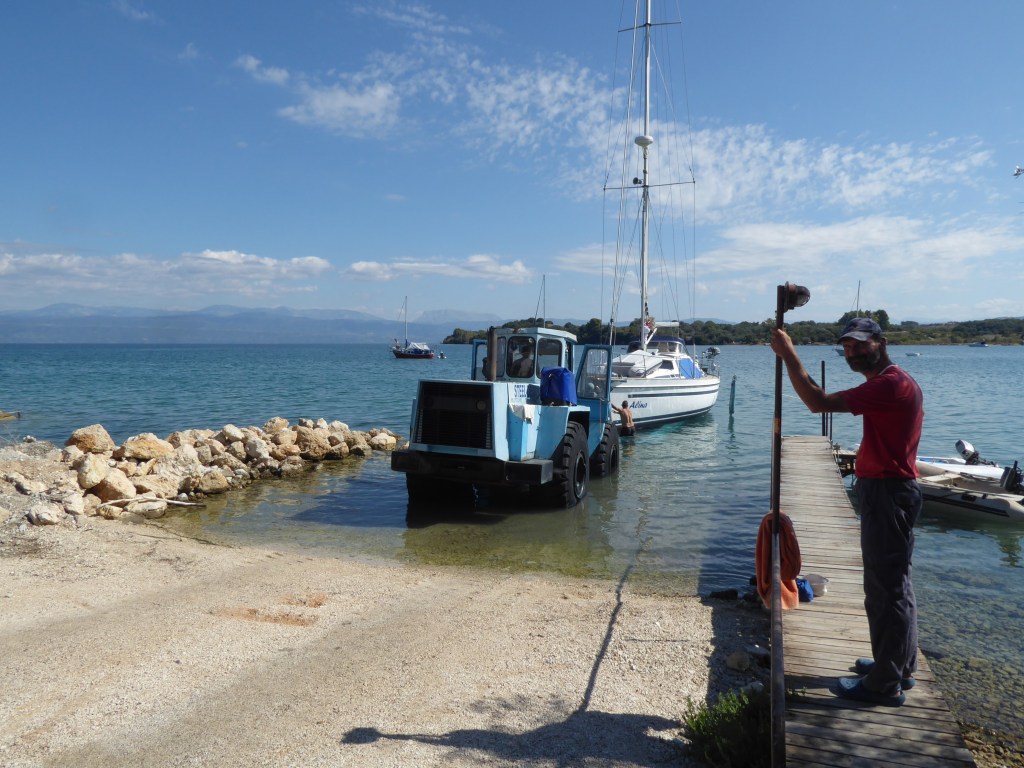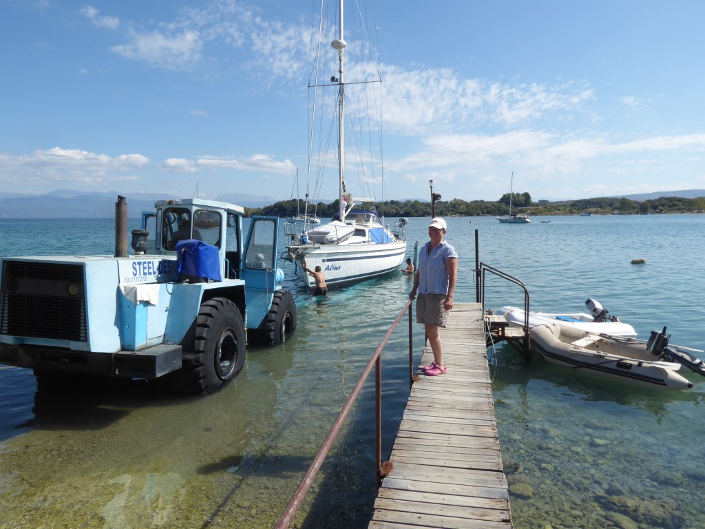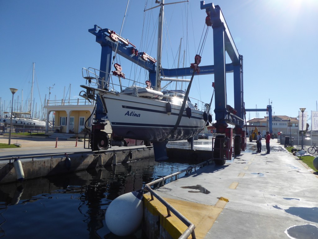 Heute gegen Mittag gehen wir wieder raus. Diesmal mit einem Travel Anhänger. Das wird spannend. Es soll erst ein Polnisches Schiff raus kommen. Wir schauen genau zu wie es funktioniert. Aber das liften wird abgebrochen da das Kiel zu breit für seinen Traveler ist und er den erst mal umbauen muss. Also kommt die Ansage das wir vorgezogen werden. Also schnell zurück, Dinghi hoch und Anker lichten. Wir fahren ganz langsam auf die Slipanlage zu und hoffen das wir genug Wasser unter dem Kiel behalten. :-0