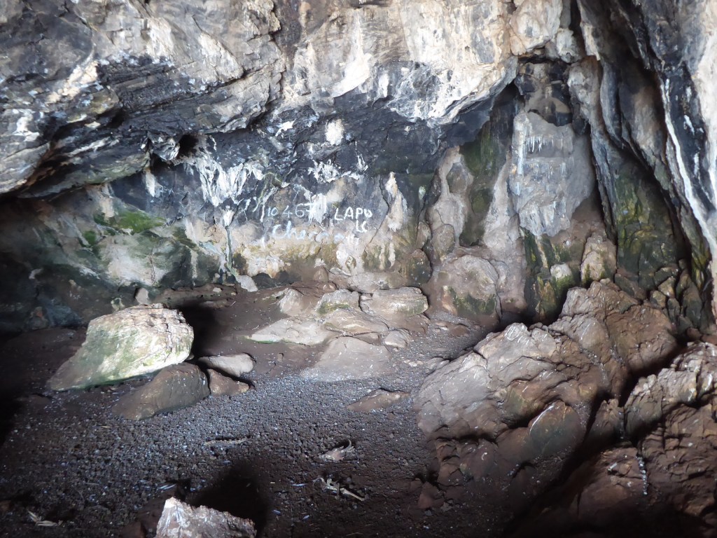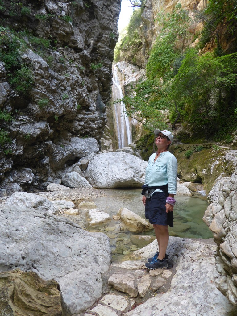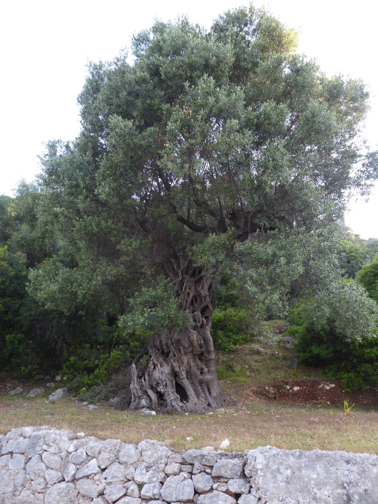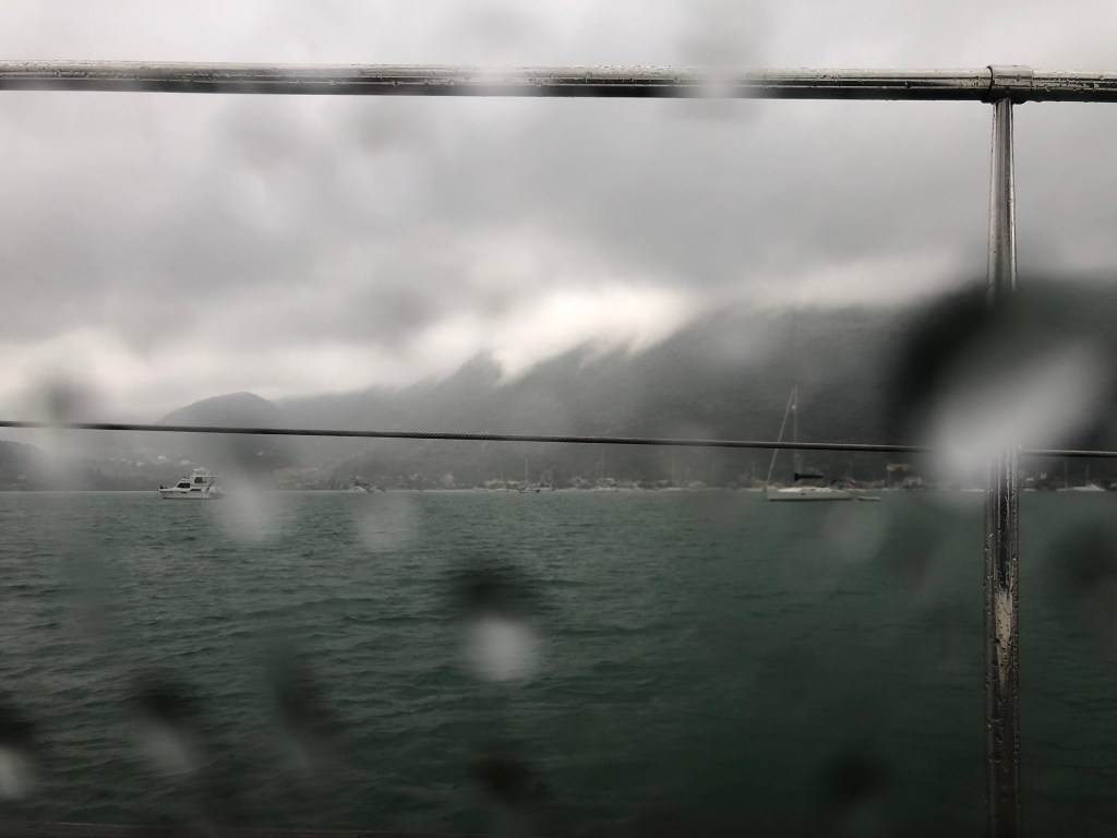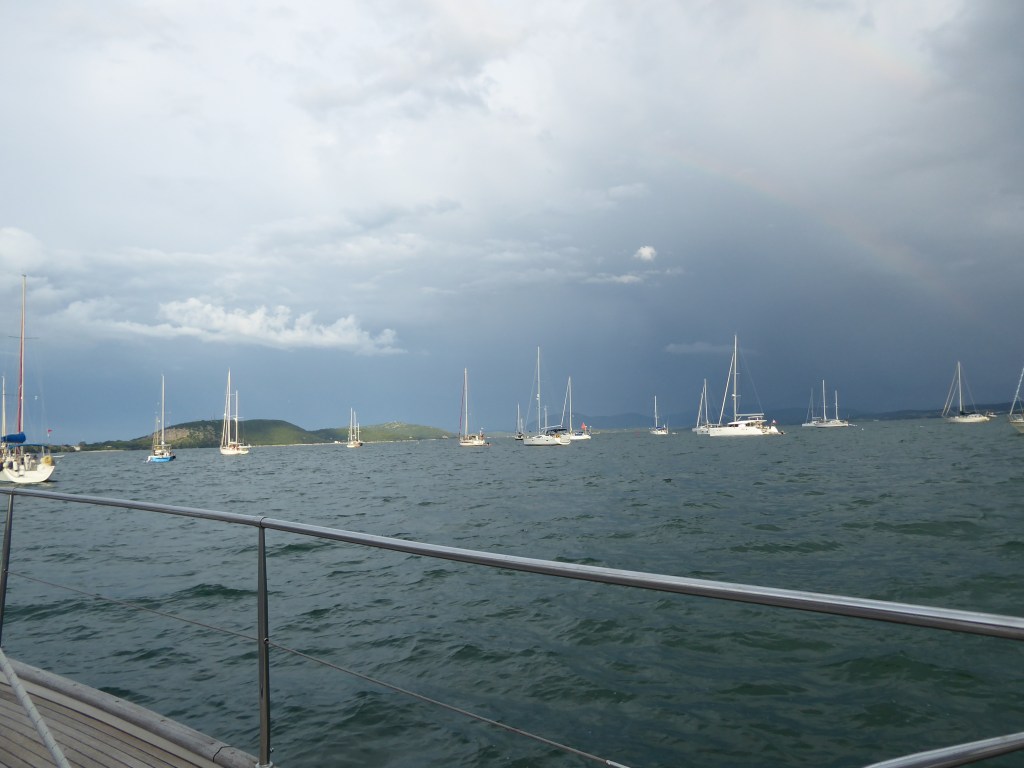 In der Bucht ist es relativ sicher. Aber es kommen mal wieder Gewitter auf. Irgendwie hört das nicht auf. Wir legen auf 5m Tiefe 35m Kette das ist gut und sicher. Als wir fest sind merken wir erst mal das Peters Angelschnur noch draußen war und die sich natürlich um den Propeller gewickelt hat als wir geankert haben und Rückwärts gefahren sind. Oh Mist. Also holt Peter sein Tauchzeug raus und befreit uns recht schnell von der Leine. Dann erst mal ankommen und essen. War ein anstrengender Tag mit 24 nautischen Meilen. Abends wird um uns rum wieder alles schwarz. Aber es zieht Gott sei Dank vorbei. Morgens fahren wir noch zu eine Felssteilwand mit Höhle. Ein sehr steiler Weg geht hoch den der Peter erklimmt.