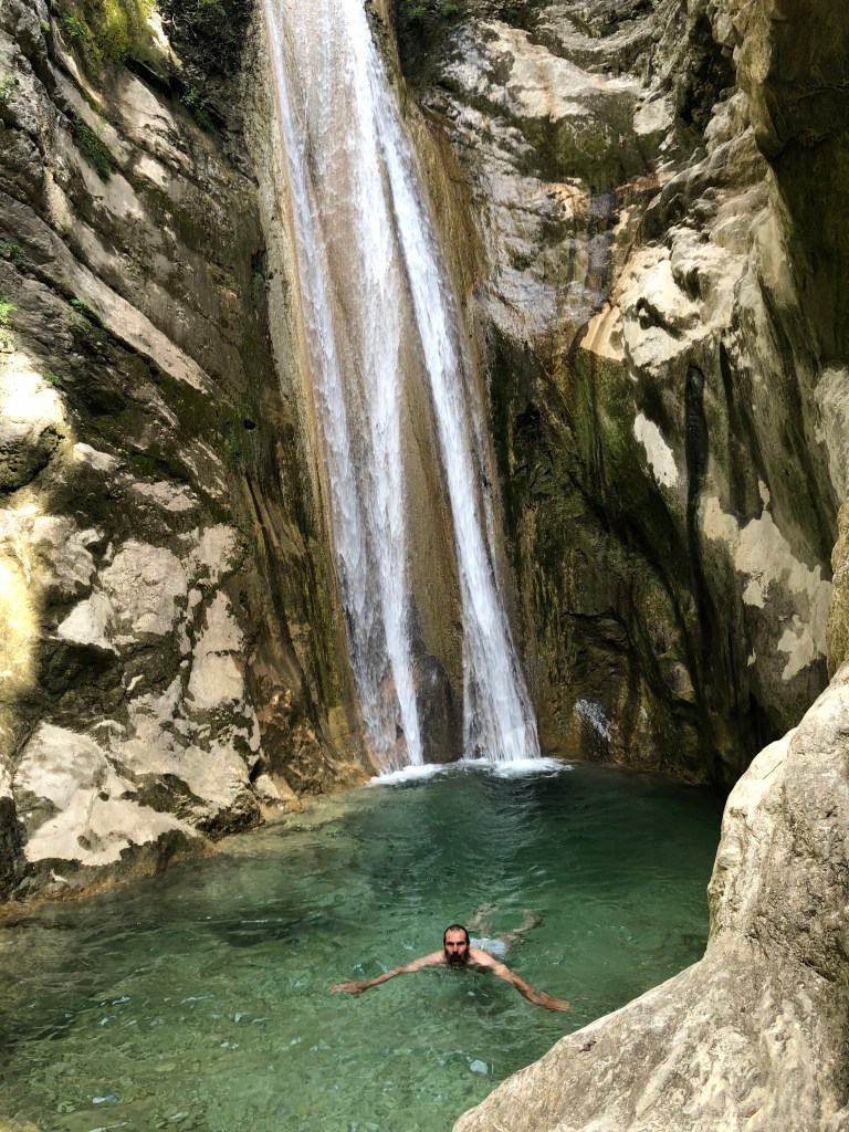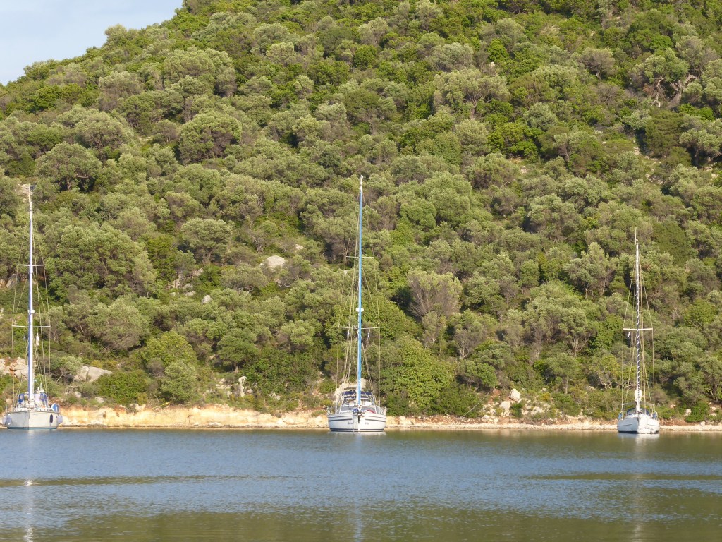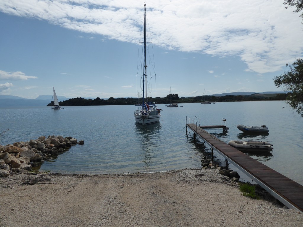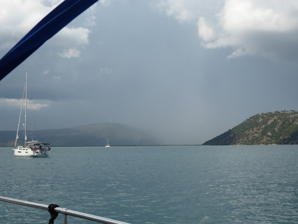 Aber es dauert nicht lange und wir haben den typischen Winddreher des Ionischen Meeres. Wir drehen ab und fahren in die Bucht Spilia auf halber Strecke nach Messalonghi. Kurz vorher briest es plötzlich auf 19kn hoch und die Wellen( die noch schlimmer sind) gehen auf 1,5m hoch.