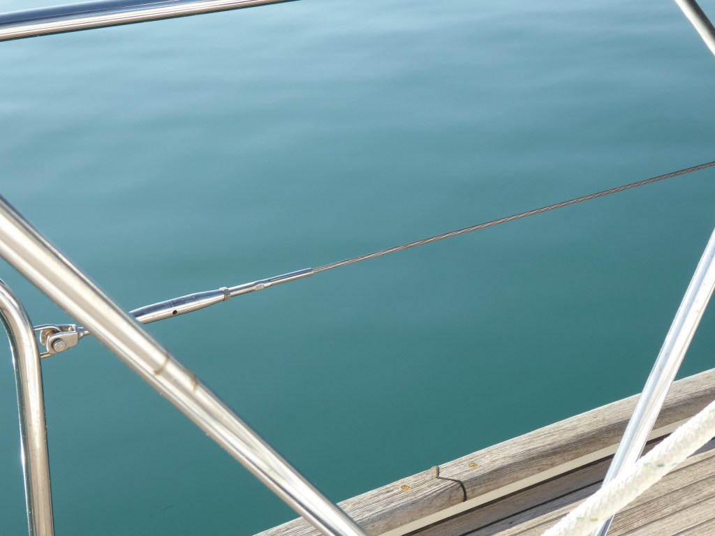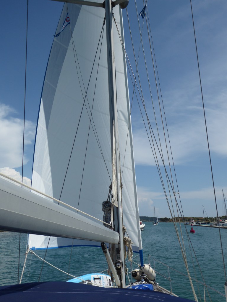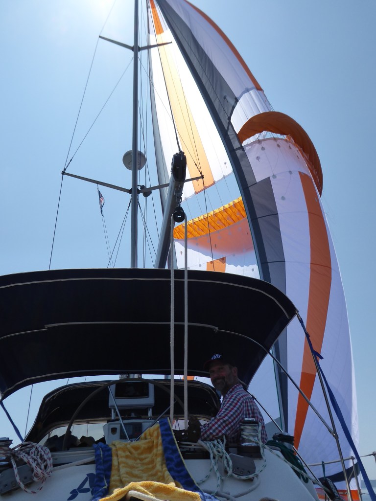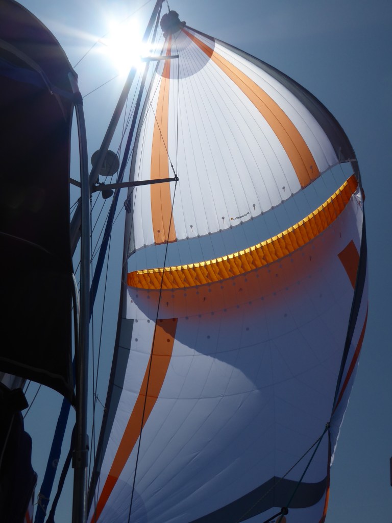 Also den Para wieder runter, was bei 13 Knoten Wind auch keinen Spaß macht. Es schaukelt ziemlich vorne an Deck. Peter turnt am Vordeck rum und ich bin am Ruder und habe vier Leinen in der Hand. :-0 Den Bergeschlauch über das Segel ziehen, dann fällt es automatisch zusammen, alle Stricke vorne ordnen, dann die Luke der Vorderkabine aufgemacht und mit der langen Wurst rein damit. Luke zu , Affe tot 🙂 . Hat alles gut geklappt.