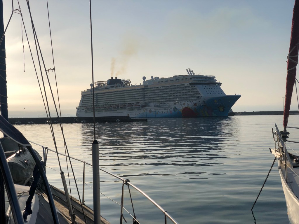 Wir kamen so gegen halb zwei an und schauten mit dem Boot in den Hafen. Aber keine Chance. Die Schiffe lagen in dreier Reihen, es war wahnsinnig eng und Boote kämpften mit Ankersalat. Nichts für uns!