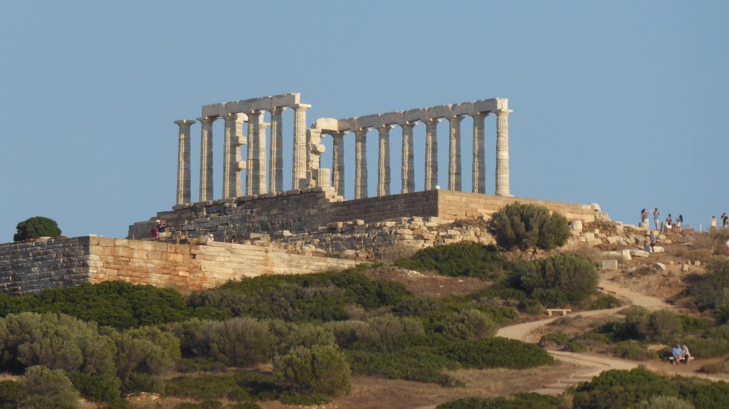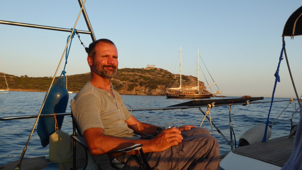 Wir hatten sehr unsteten Wind und irgendwann einfach keine Lust mehr. Wir sahen in der Ferne eine Bucht mit einem Tempel und warfen einfach dort den Anker. Nun sind wir am Festland auf Attika und dieser Tempel ist der berühmte Poseidon-Tempel.