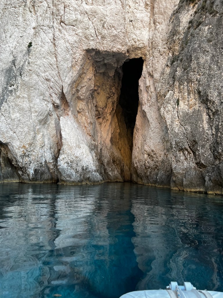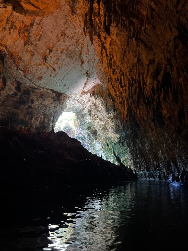 Unter Kefalonia fließt ein Flusssystem das sogar tiefer wie der Meeresspiegel in den Melissani-See der Drogarati-Höhle auf die andere Seite fließt. Die Farben des unterirdischen Sees sind traumhaft da bei dem Erdbeben damals die Decke einbrach und die Sonne das Wasser tief grün bis türkis scheinen lässt.
