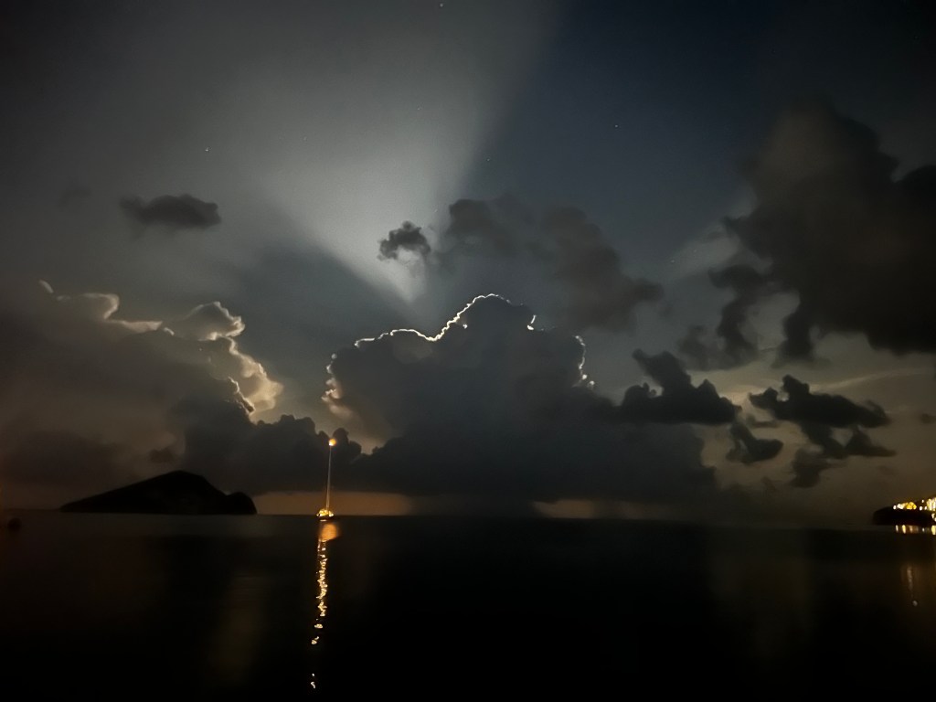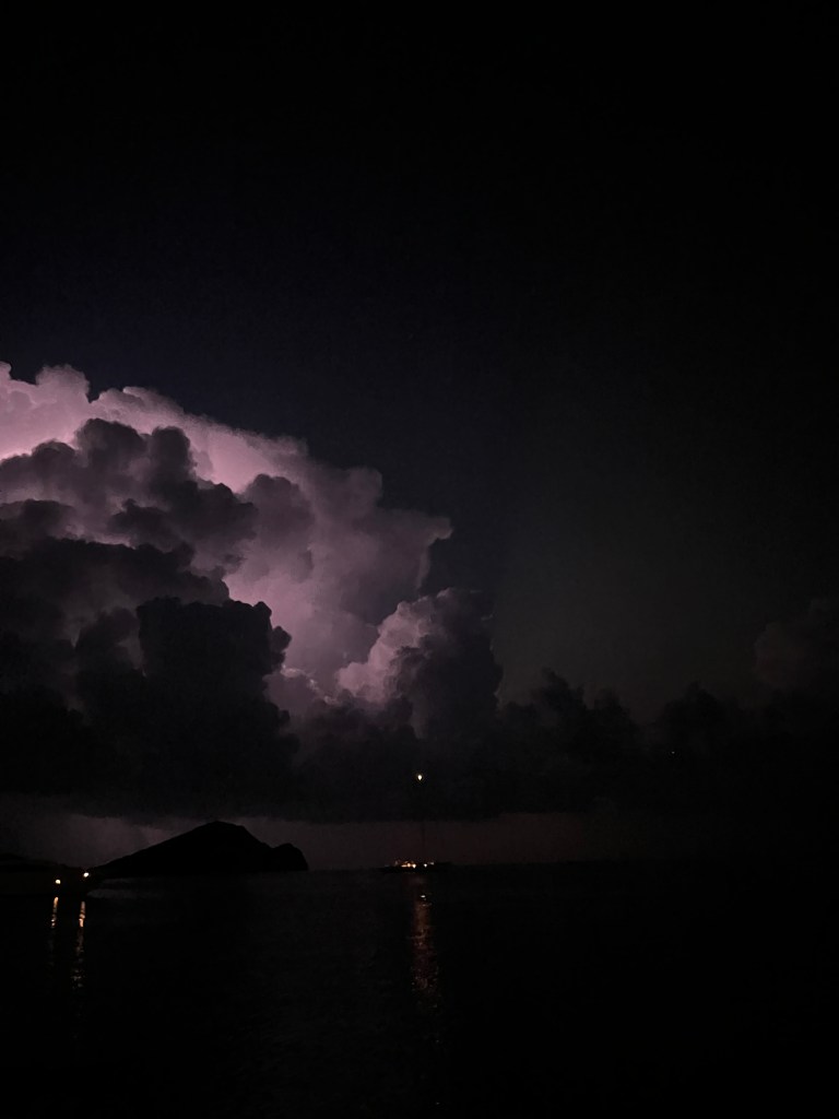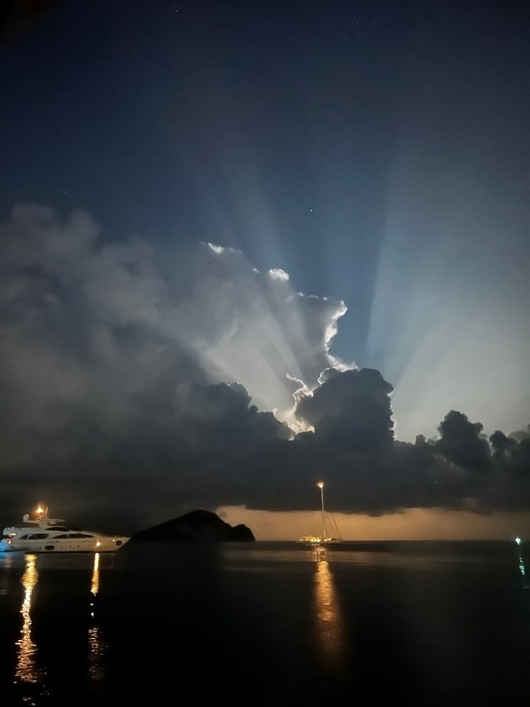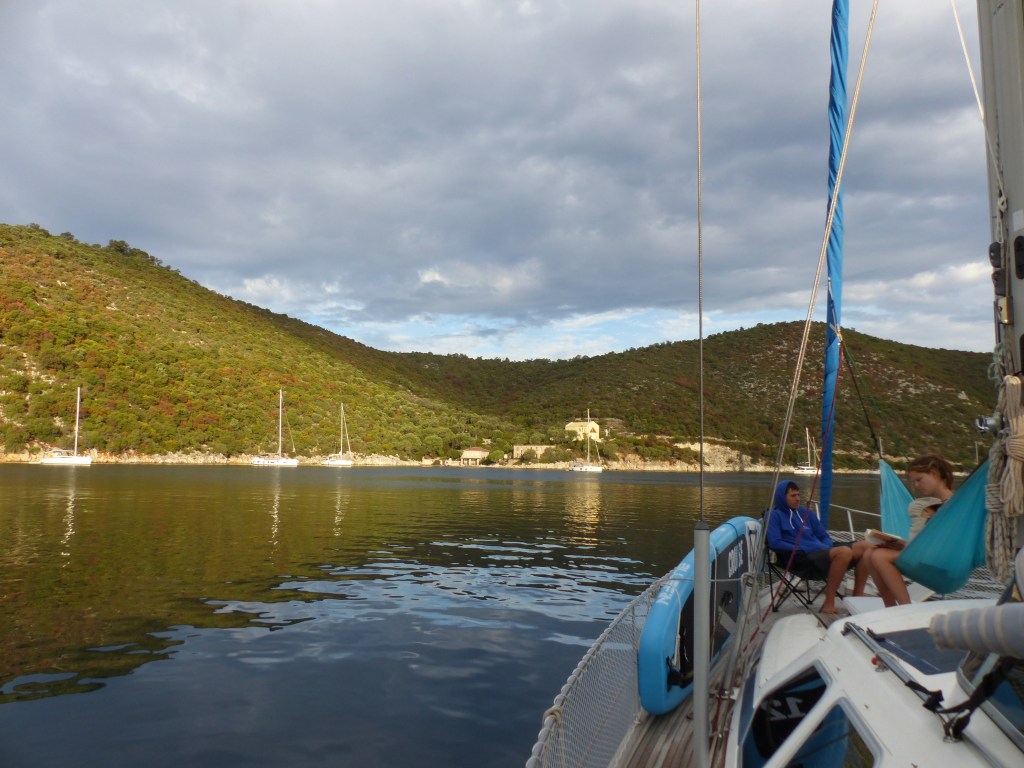 Nach einer Woche verlassen wir Zakynthos und segeln nach Kefalonia in die tiefe Bucht der Hauptstadt Argostoli. Denn es sind wieder schwere Gewitter angesagt. Es ist eine gut geschützte Bucht. Nachdem Lukas, Anja und die Kids etwas einkaufen waren und wir wieder alle zusammen beim Essen an Bord sind, beginnt es auch schon zu schütten. Der Wind legt zu aber alles ist gut. Nachts toben um uns rum die Gewitter und es schüttet immer wieder. Wir liegen gut und ich mache mir gar keine Sorgen. Nur etwas aufmerksamer ist man doch.