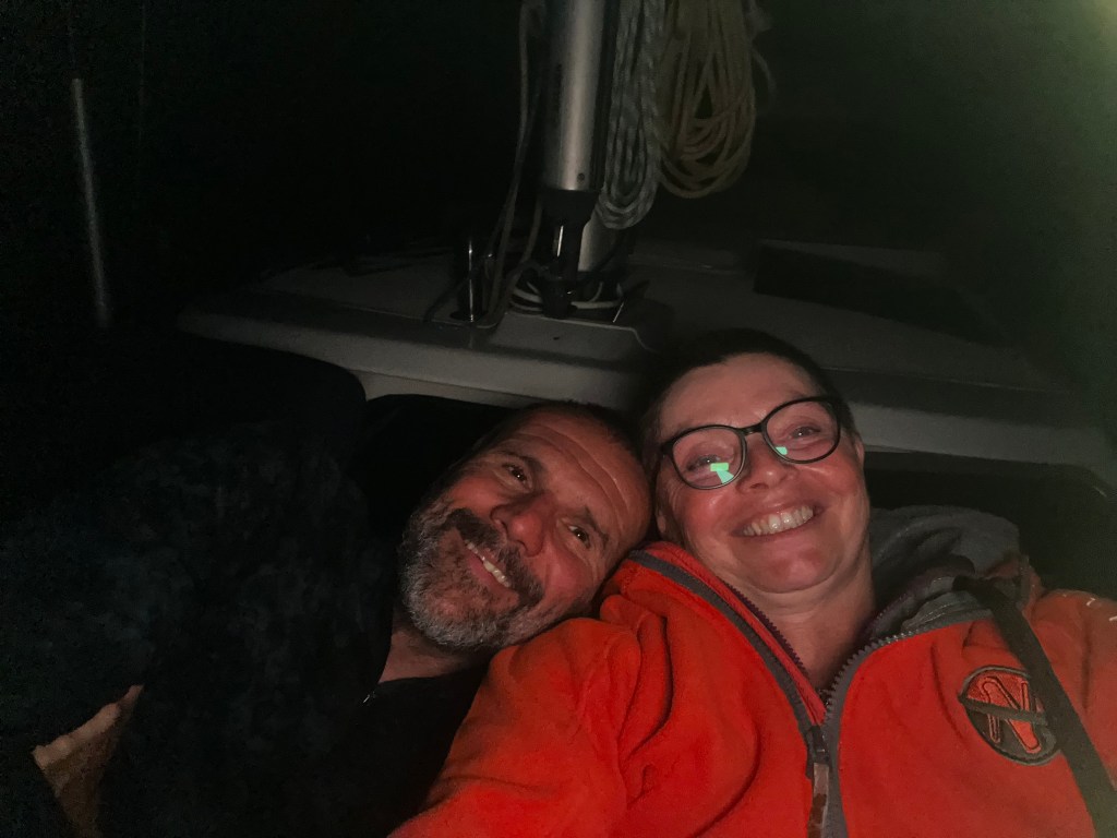 Ich schätze 3-4m hohe Wellen. Aber sehr langgezogen. Sie fühlten sich wie Atlantikwellen an. Die Wellen kommen von Südwest. Dazu kommt ein sportlicher Wind aus Südost. Durch ihn sind wir sehr schnell unterwegs allerdings bringt er auch eine neue Windwelle von Südost.