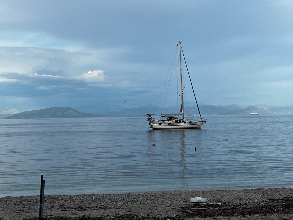 Am nächsten Morgen ist um halb zehn der gewünschte Wind da und wir segeln nach Korfu. Nach zwei Stunden ist der Wind weg und kommt auch nicht mehr wieder. Also Motoren wir den Rest nach Petriti und legen uns hier in die Bucht.
