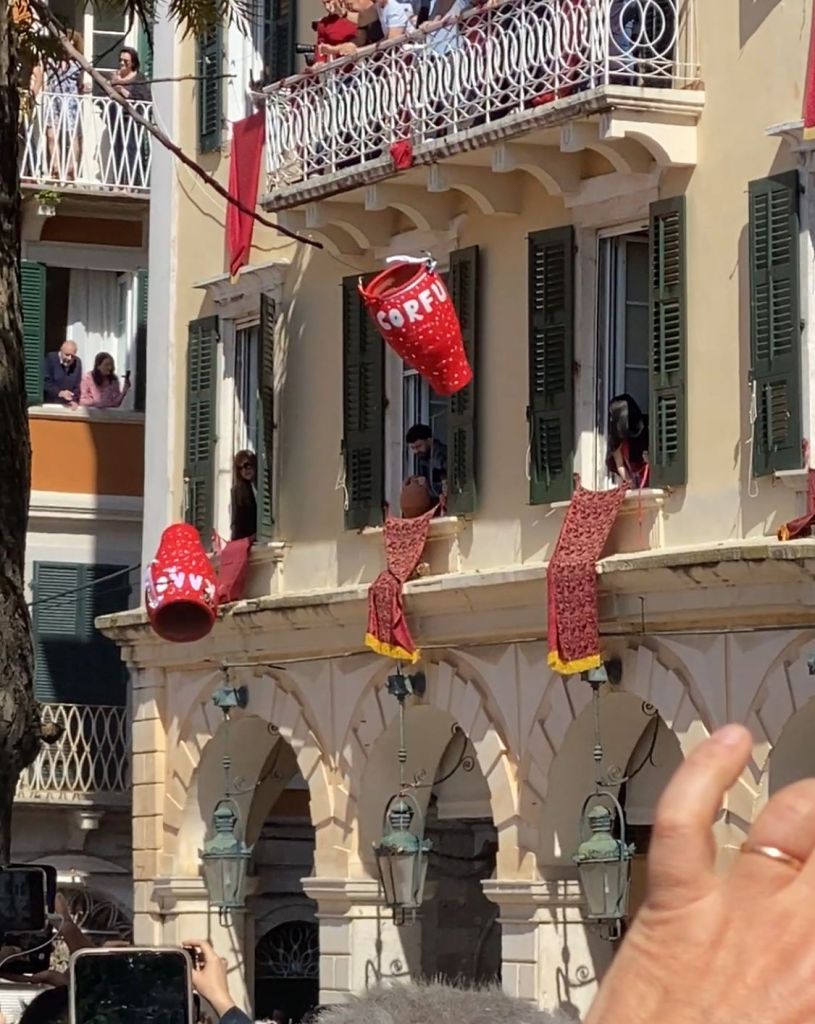 Am Ostersamstag ist eine Prozession zu Ehren des Schutzpatrons der Insel, des heiligen Spyridon der die Insel vor der Pest bewahrt hat. Um 11 finden sich tausende von Menschen zur „ersten Auferstehungsfeier“ im Altstadtviertel ein. Ein großes Spektakel bei dem mit Wasser gefüllte Tongefäße auf der Straße zertrümmert werden. Ein alter Brauch der von den Venezianern übernommen wurde. Diese pflegten am Neujahrstag alte Gegenstände aus dem Fenster zu werfen, auf dass das neue Jahr, Neue bringe.