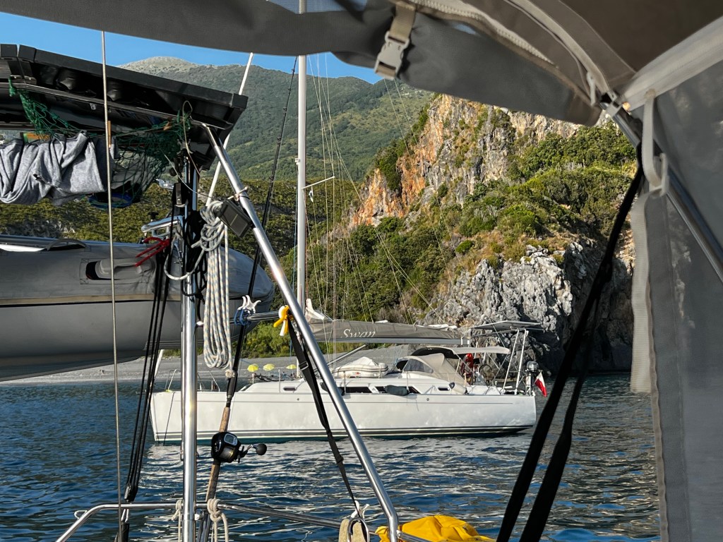 Hier ist es aber auch extrem. Hunderte Boote fahren die Küste rauf und runter und verursachen durch ihr Tempo hohe Wellen die uns meistens am Anker von der Seite erwischen. Und das ist sehr unangenehm. Auch für uns ist das nicht schön denn die Italiener lieben Motorboote und schnelles fahren. Und es ist auch noch Wochenende. Es kommt also alles zusammen.