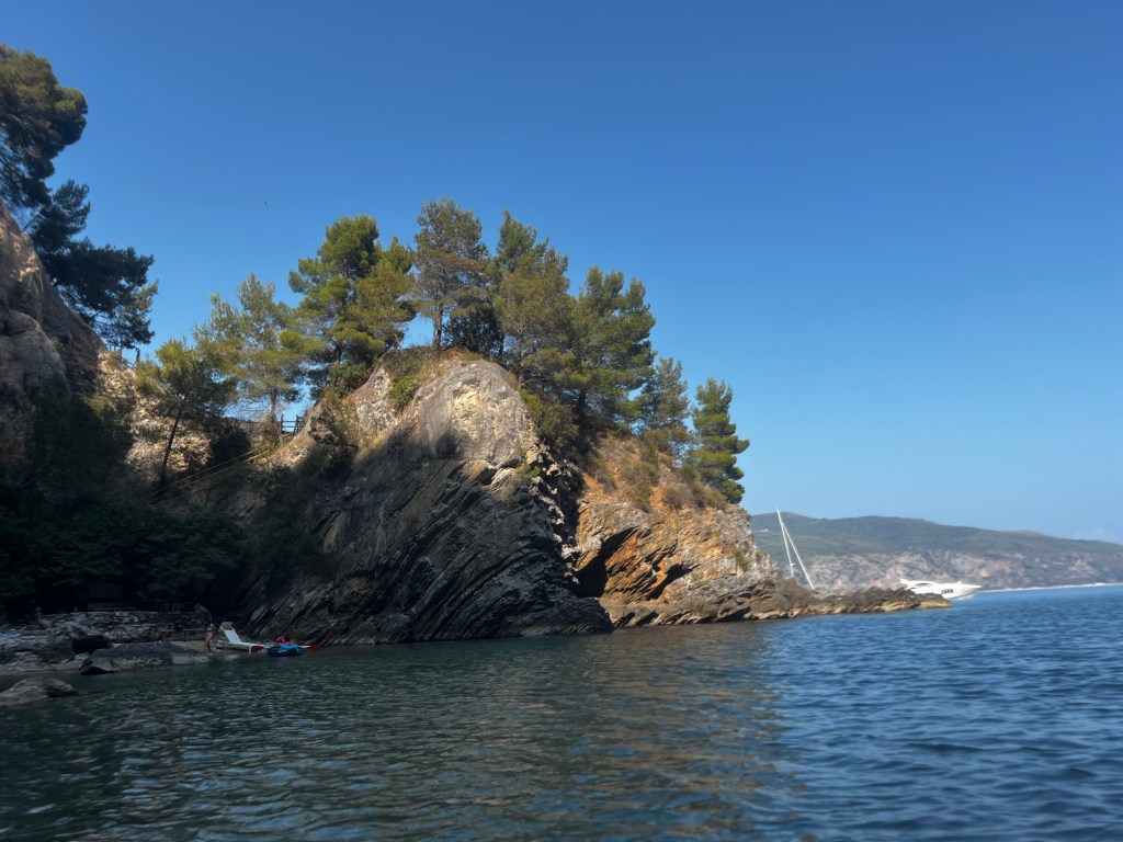 Da wir eine Wanderung machen wollen beschließen wir an Land zu schwimmen . Wir stecken alles in wasserfeste Säcke und dann los. Das klappt sehr gut und wir haben eine schöne Zeit an Land.