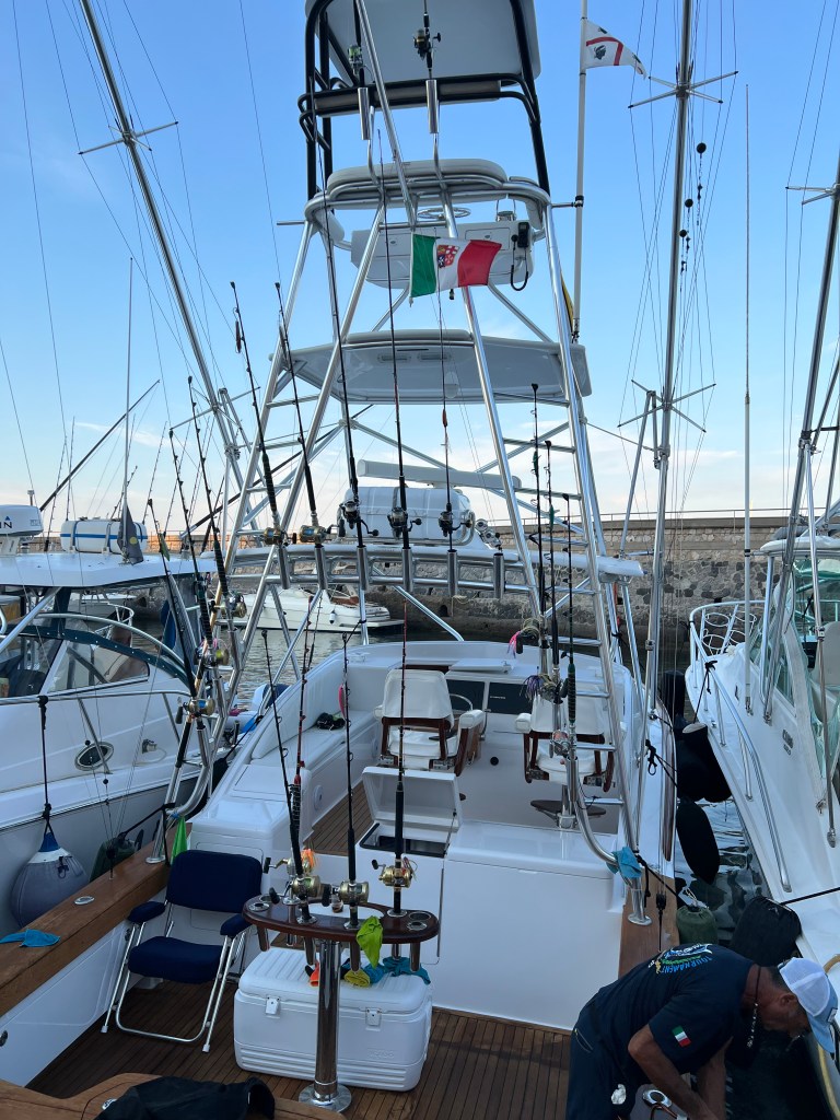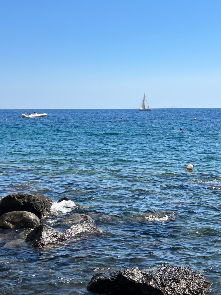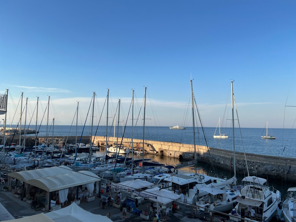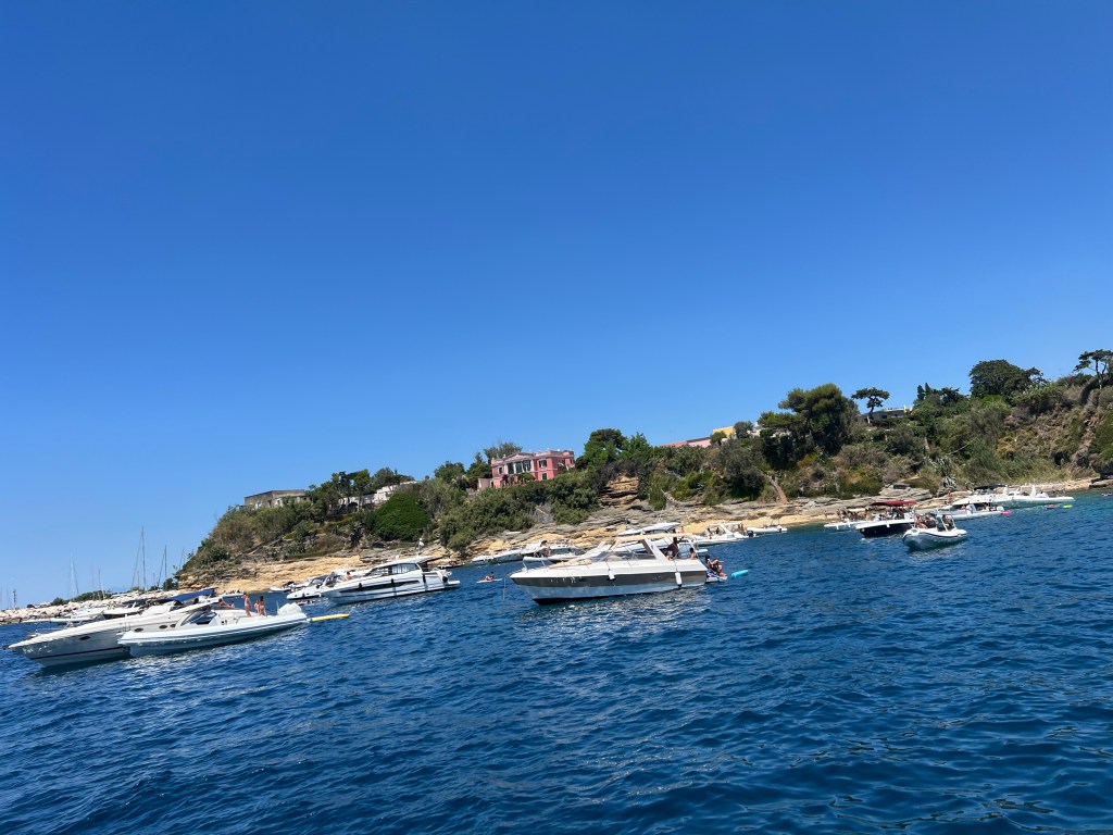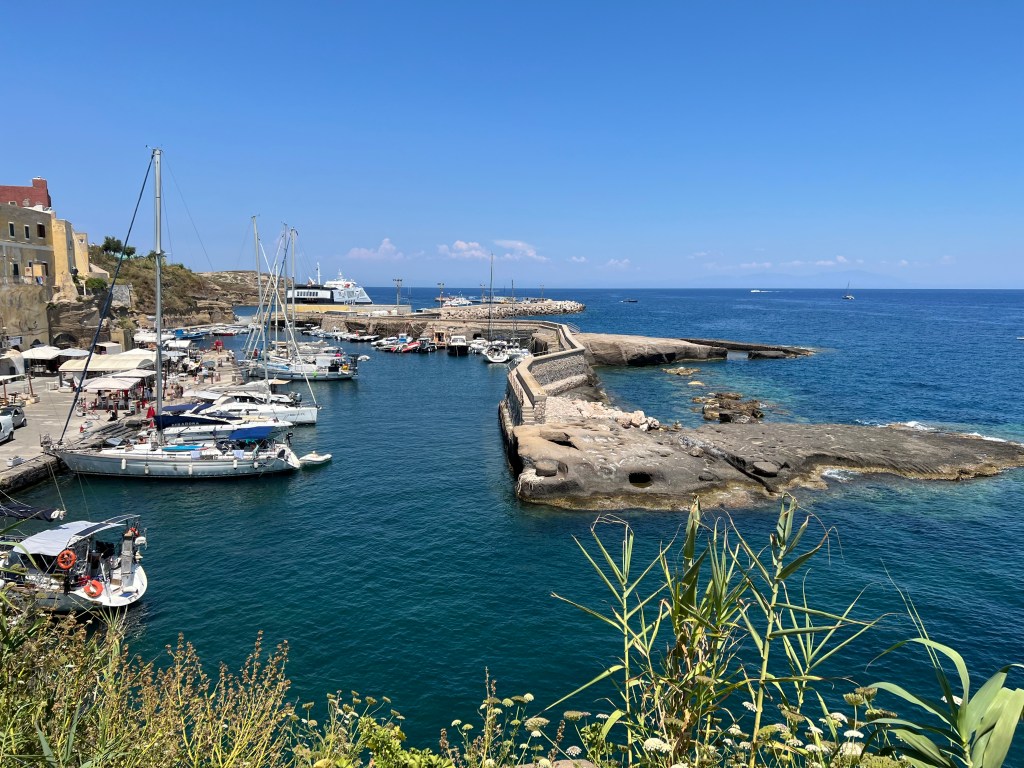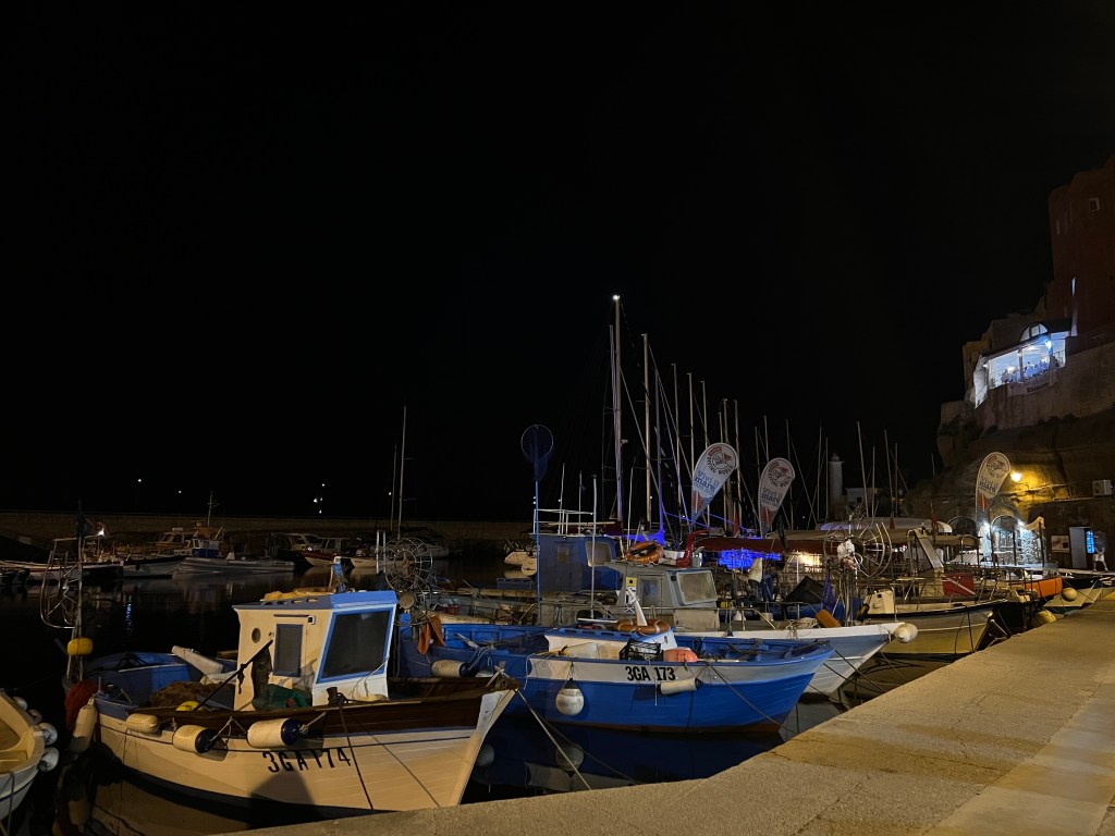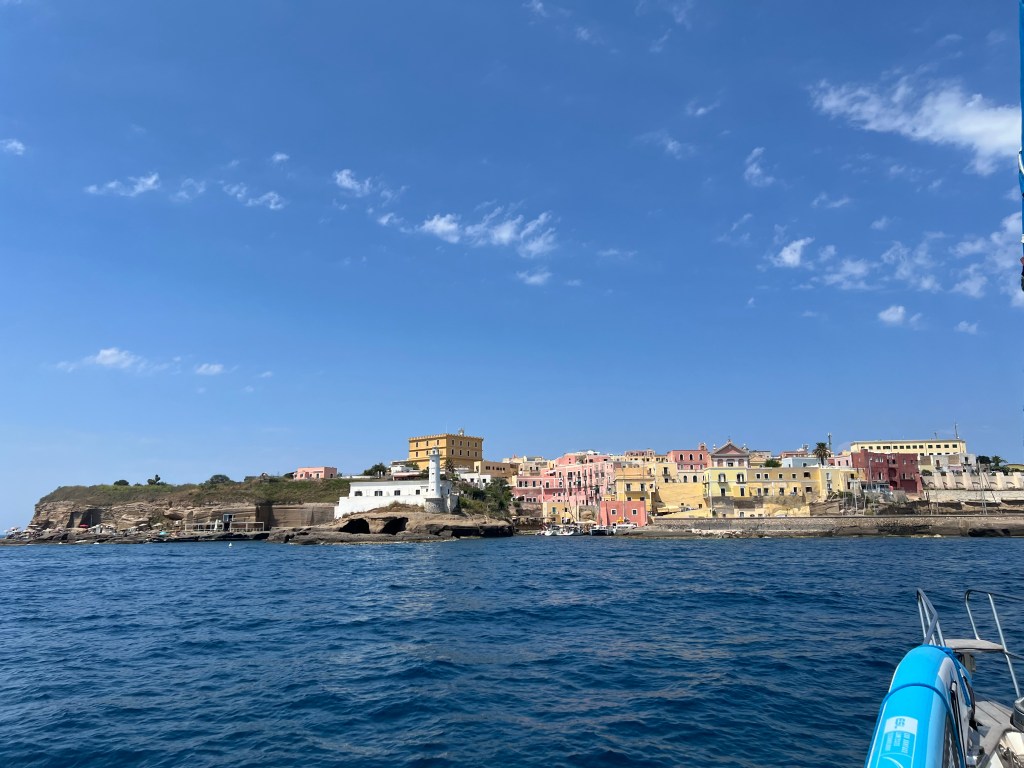 ist für uns zuerst einmal ein Zufluchtsort denn über Ventotene geht ein Starkwind Feld und wir suchen einen Ort der uns etwas Schutz bietet. Das bedeutet 30 Seemeilen Richtung Festland segeln. Diese Strecke ist etwas besonderes für uns denn wir sehen zwei junge Finnwale. Erst denken wir, es ist ein verloren gegangener Container und das Wasserblasen wird durch die Wellen verursacht. Aber dann können wir es genau erkennen. Einfach magisch. Die Tiere sind eine ganze Weile an der Wasseroberfläche und lassen sich einfach treiben. Als aber ein Motorboot angerauscht kommt tauchen sie ab und wir sehen die großen Fluken wie sie vor dem Abtauchen in die Höhe gehen. Echt ein Wow-Moment. Mit Walen habe ich hier nun gar nicht gerechnet aber scheinbar gibt es in dieser Gegend ein Schutzgebiet. Außerdem sehen wir viele jagende Tunfische die von unserem Köder aber leider nichts wissen wollen😥.Und am Ende des Tages besuchen uns noch Delfine. Was für ein Segeltag.