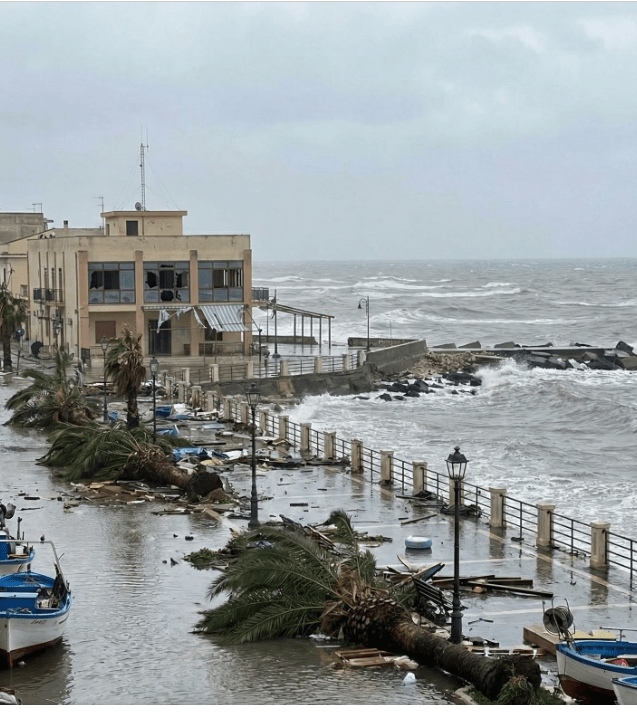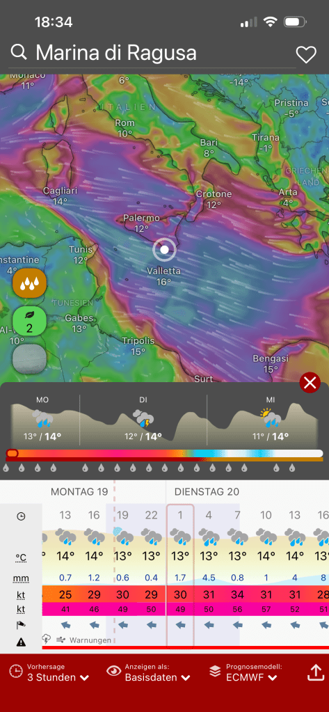 Denn die Wellen hatten 1300km um sich aufzubauen und nichts würde sie bremsen. Es war enorm! Der Meeresspiegel stieg noch dazu und ließ alles mit voller Wucht auf die Küste prallen. Es ist im armen Sizilien und anderen Regionen, viel zerstört worden. Auch von den noch folgenden Stürmen. Aber um es kurz zu machen, wir haben einen guten Hafen ausgewählt.