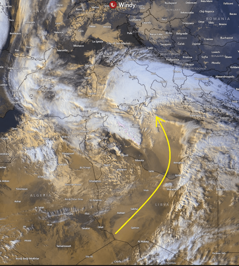 Es hat auch sehr viel geregnet. Und dieser Regen hat den Sahara-Sand auf alles gelegt. Wiedermal ist alles orange.