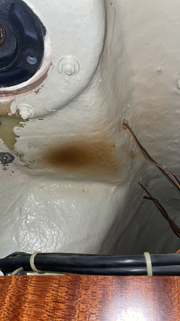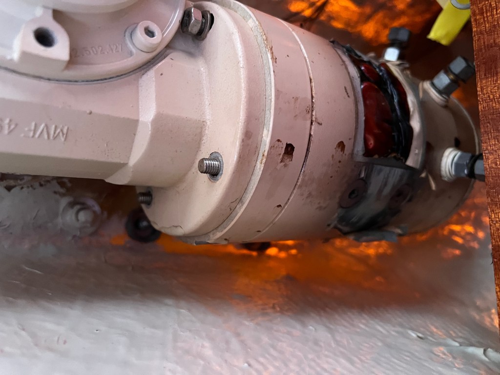 Wir bauten die Decke in der Küche ab und sahen das der Motor kurz vor dem Brand stand. Der Außenlack war schon verkohlt und das GFK oben drüber hatte auch schon einen dunkel braunen Fleck. Also Motor raus bauen und auf Fehlersuche gehen.