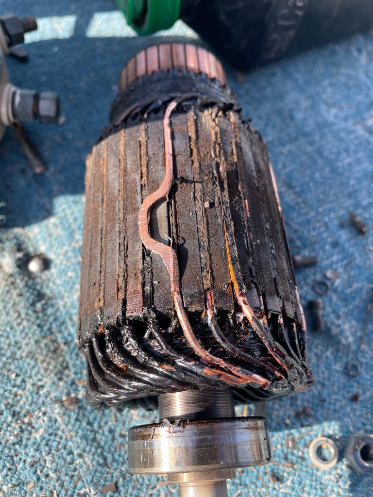 Das Ergebnis ist, das durch den Betätigungsschalter wohl Feuchtigkeit eingedrungen ist und der Motor unter Dauerstrom kam. Die Winsch hat aber nur halb gedreht weil in der Wicklung ein Draht den Motor blockiert hat. Aber Strom floss weiter Und durch die entstehende Hitze ist der Innenraum unter Rauch gesetzt worden.