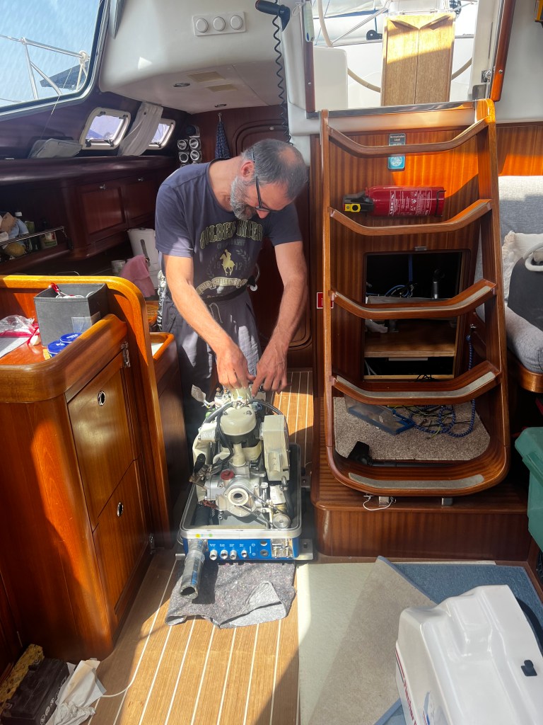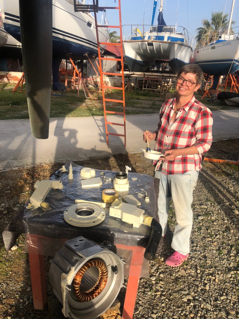 Seid drei Wochen sind wir im Wasser. Die ersten fast zwei Wochen haben wir auf den Zylinderkopf gewartet, den ich nach langem suchen über Bulgarien in Deutschland gefunden habe. Die Lieferung hat etwas Geduld gekostet, dann aber doch sehr gut geklappt. Peter hat bis dorthin sehr viel Arbeit in den Generator gesteckt. Hat alles penibel sauber gemacht. Alle Kanäle die zur Kühlung dienen, waren komplett mit Salz und steinhartem Schmodder zu. Es war eine heiden Arbeit. Ich habe ihm geholfen wo ich konnte.