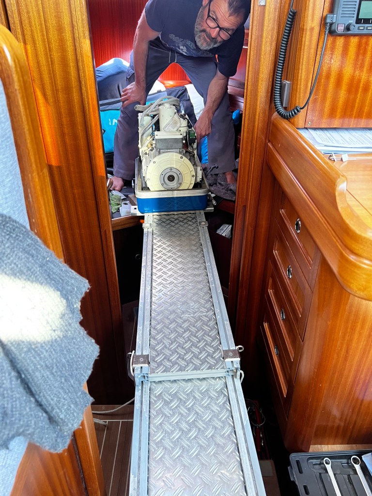 Bald ist der Moment da wo wir den Generator wieder an seine alte Stelle im Motorraum bugsieren müssen. Das sind knapp 100kg die bewegt werden müssen.