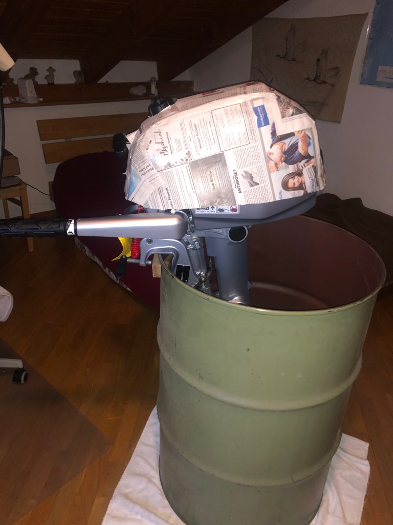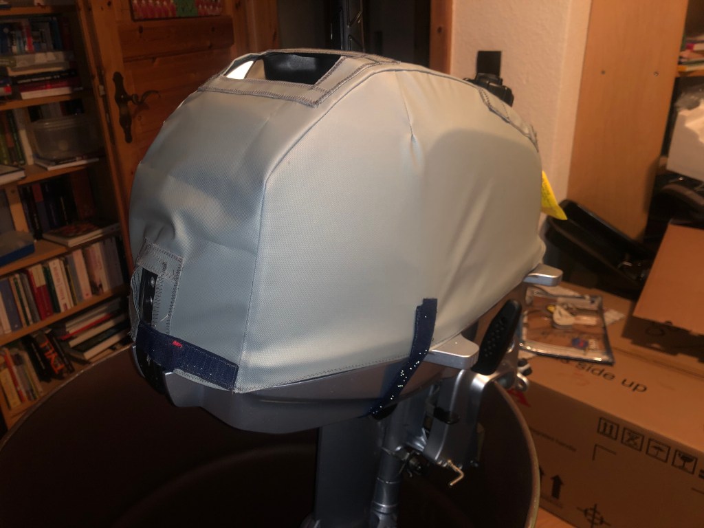 Jetzt ist er da, die Werkstatt ist fertig und ich habe Zeit, eine Abdeckung für den Motor zu nähen. Die Schritte sind die gleichen wie beim Schlauchboot. Zuerst mache ich mit Zeitungen ein Schnittmuster. Damit belege ich den Motor, klebe die Zeitungsstücke zusammen bis alles passt.